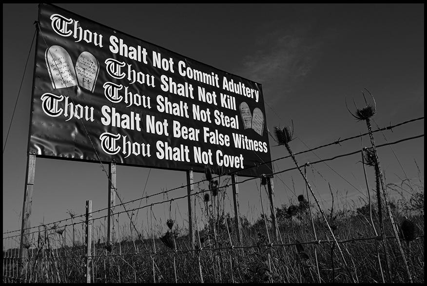 In my attempt to understand them, I began to photograph them - (which is the way I have always made sense of the world). At first the billboards all had the same look: black metal with white lettering. And each message seemed to reflect Old Testament Scripture.
